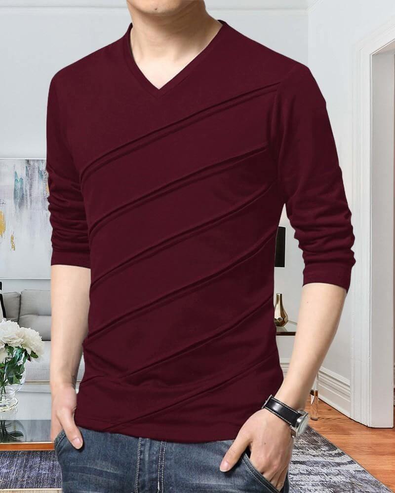 This men's casual T-shirt is made from a breathable cotton blend with a solid pattern in a maroon color. It is designed with a regular fit and full-length sleeves and features a V-neck for added comfort. Ideal for day-to-day wear, the lightweight design ensures breathable, all-day comfort.