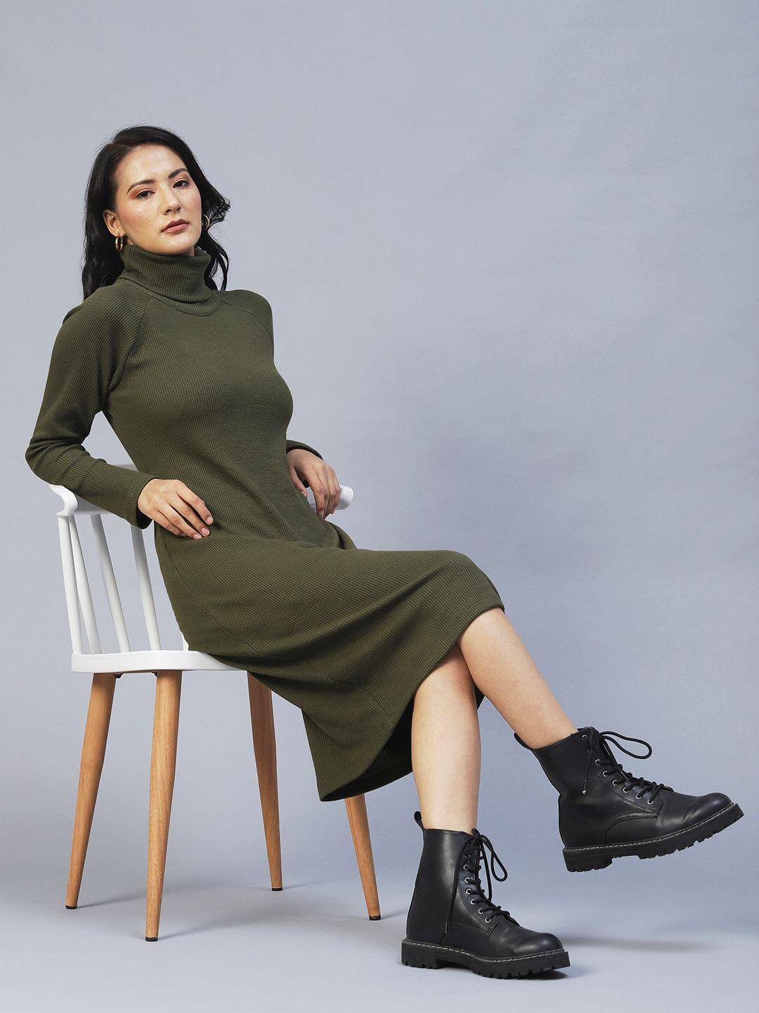 Rigo Women's Olive Green Turtle Neck Waffle Knit Cotton Midi Dress
