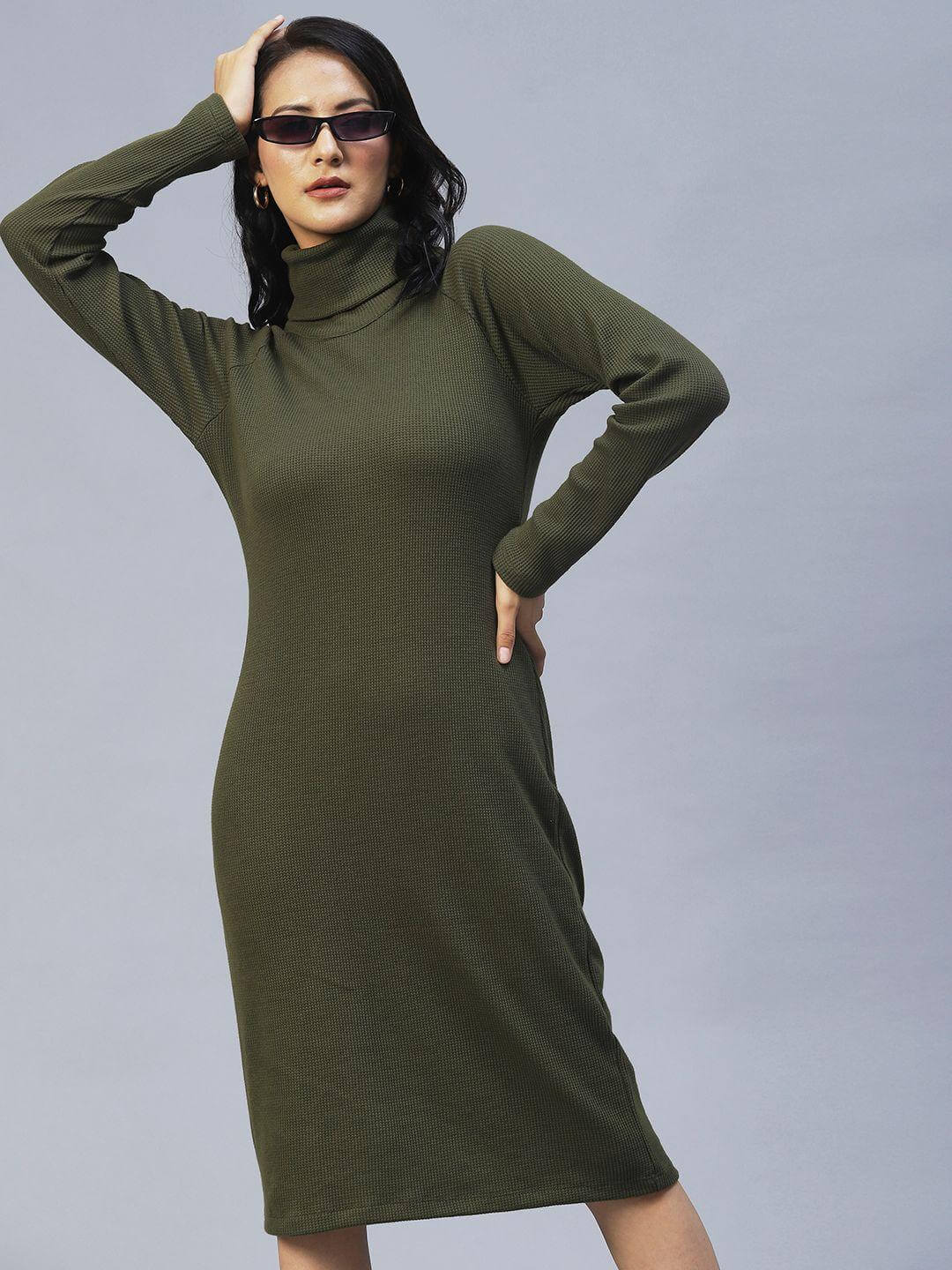 Product Name: Rigo Women's Olive Green Turtle Neck Waffle Knit Cotton Midi Dress Package Contains: It has 1 Piece of Midi Dress Size In Inches: S/34 Fabric: Cotton Color: Olive Pattern: Self Design Style: Shift Occasion: Casual Combo Of: Pack of 1 Brand: Rigo Length: Mid Length Length In Inches: 40 Sleeve Length: Full Sleeve Wash: Machine Neck Type: Turtle Neck Weave Type: Knitted Weight: 500 This timeless piece of apparel features a classic waffle knit design and comes in vibrant colors, perfect for making a statement. Be confident in the superior quality and craftsmanship of this midi dress.